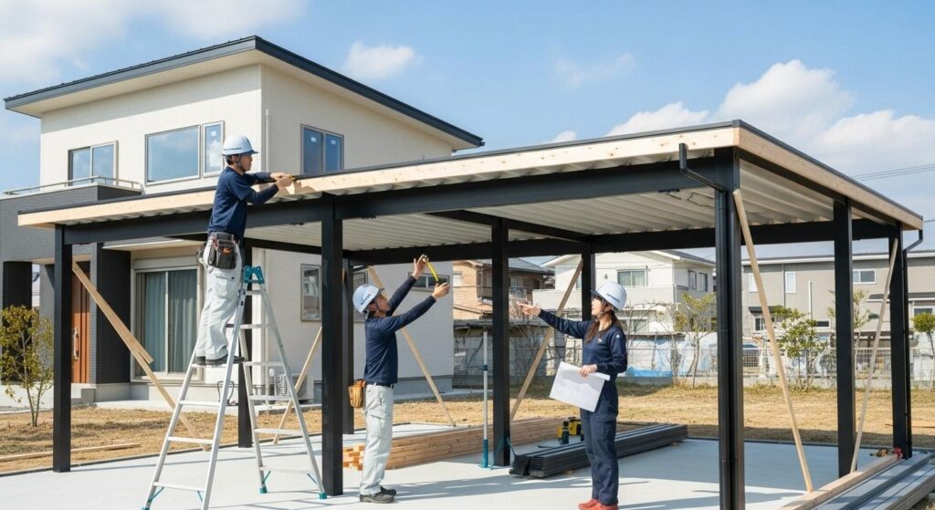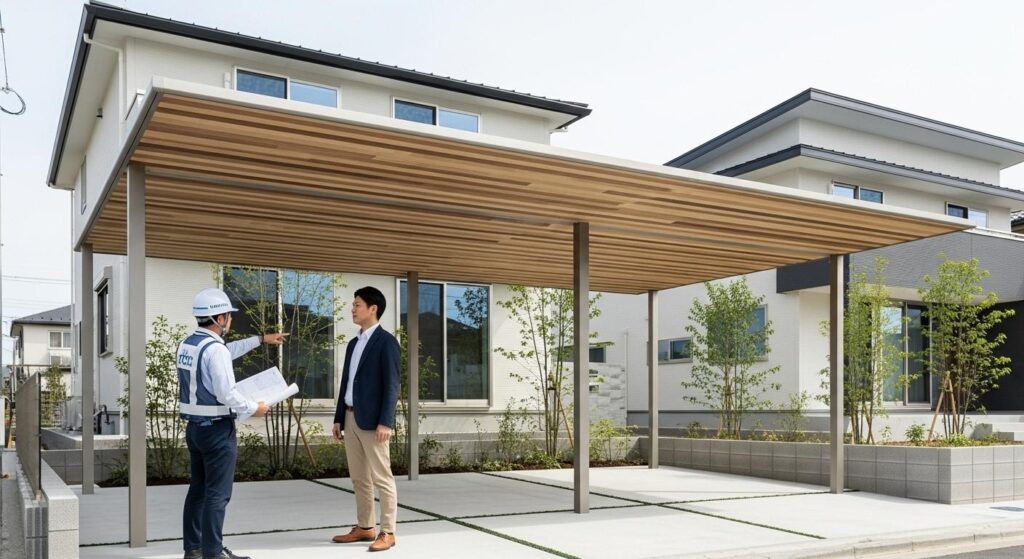 - 事例B(強度重視): LIXIL「カーポートSW」等の折板屋根タイプを新設。遮光性が高く頑丈。総額約90万円前後。